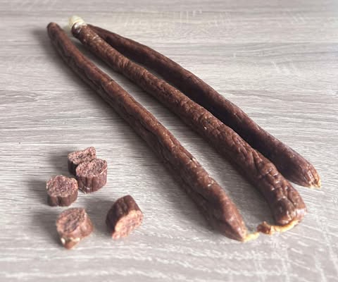 Ingredients: Beef (82%), Dried sweet potato (6.5%) Dried Apple (2%), Minerals, Collagen casing